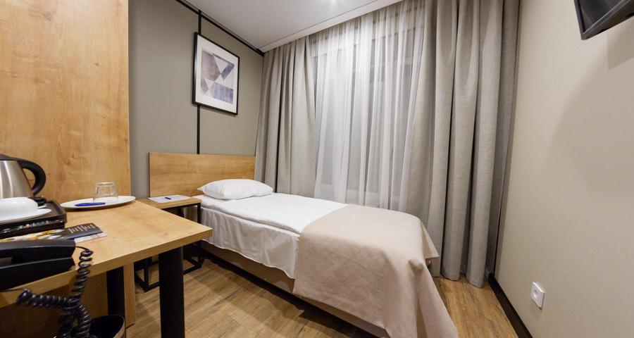 Небольшой уютный 1-комнатный номер с кроватью (90х200), прикроватной тумбой и отдельным санузлом (номера данной категории кондиционерами не оснащены). В номере есть все необходимое для комфортного размещения гостей.