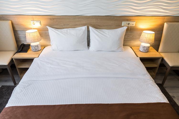 В номере: Две широкие кровати (1,4х 2м), шкаф, прикроватная тумба (2), пуфик, прихожая, зеркало, телевизор с плоским экраном (кабельное ТВ), внутренний телефон